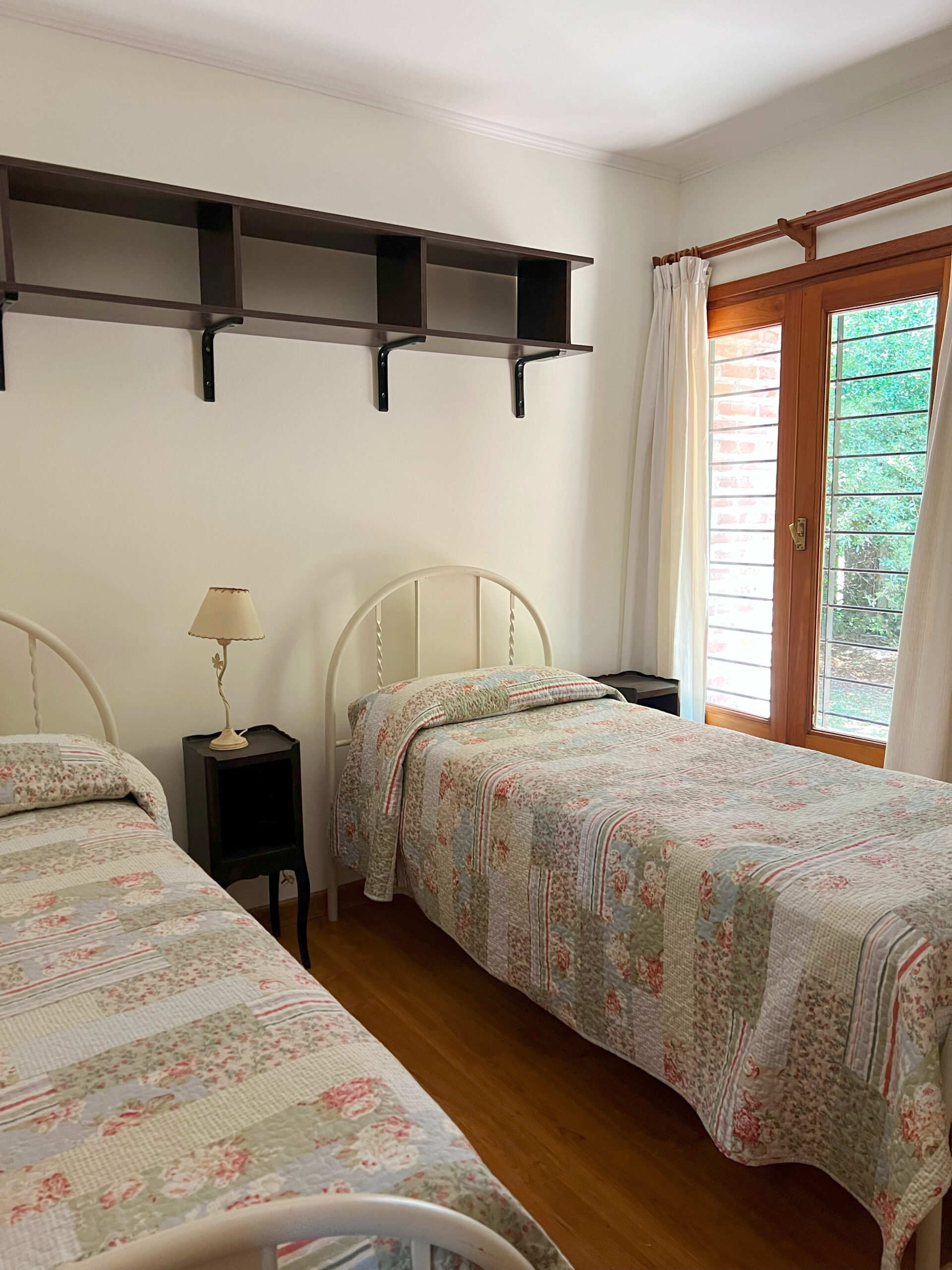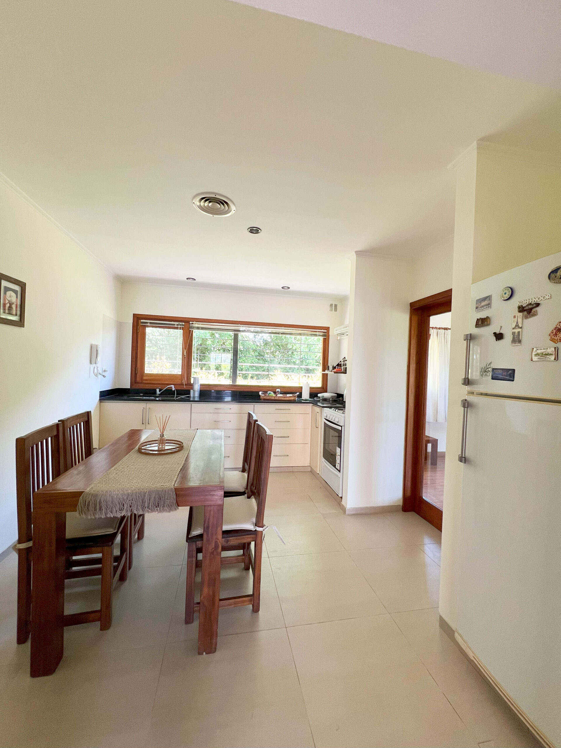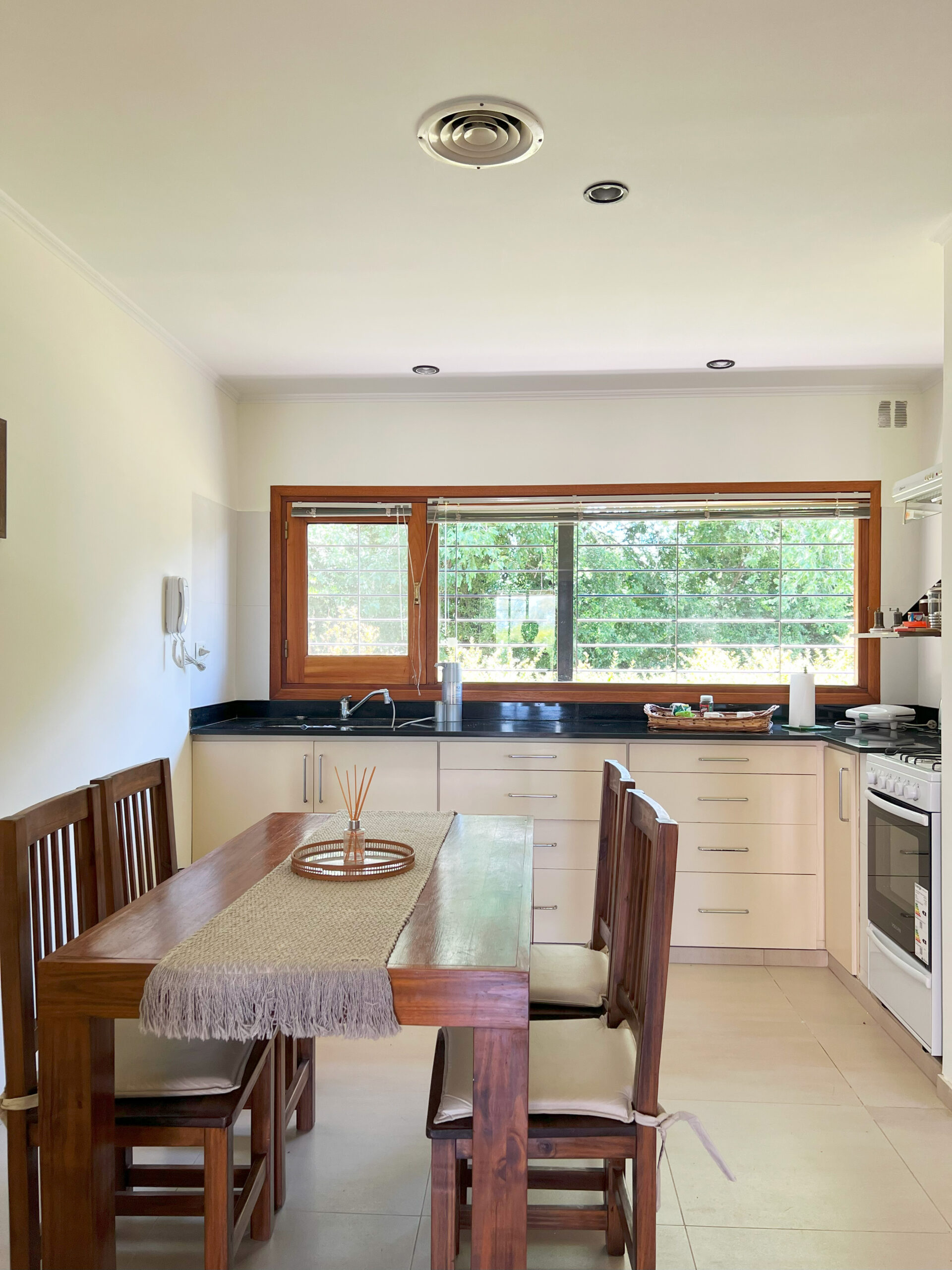 La casa cuenta con una habitación matrimonial con vestidor, una habitación con dos camas y sofá cama, baño completo, cocina completa con todos los utensilios. Amplio living-comedor, quincho techado con parrilla, lavadero y pileta. Es un terreno de 3.000m2 y tiene capacidad hasta seis personas.